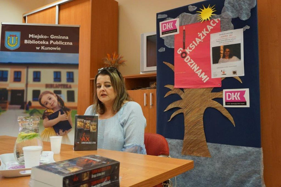 O tym, jak stać się znanym pisarzem nie mając kilkunastu asystentów i obszernego konspektu na dysku, a także o losach Polaków w Kazachstanie i wielkich wydarzeniach historycznych, rozmawialiśmy z pisarką Joanną Jax 14.06.2019 r. Pomimo upału i przebytej drogi na krańce województwa świętokrzyskiego, autorka poczytnych, monumentalnych sag, wkroczyła do biblioteki z uśmiechem i bez oznak zmęczenia. Powitaliśmy ją entuzjastycznie, bowiem nasz klub jest niekwestionowanym fanem twórczości tej autorki.