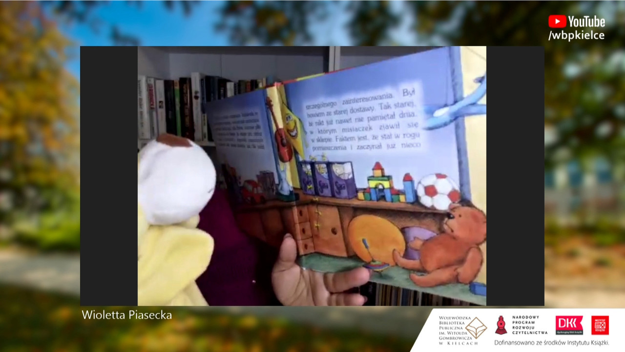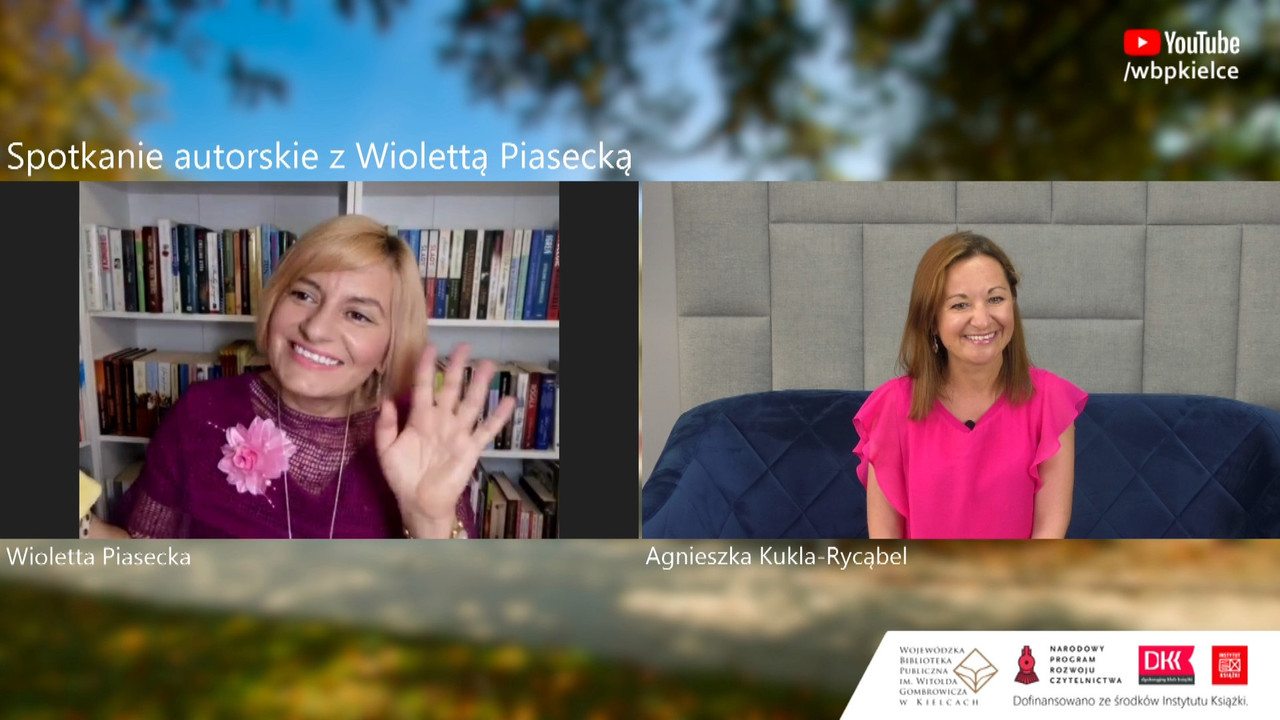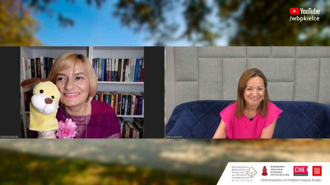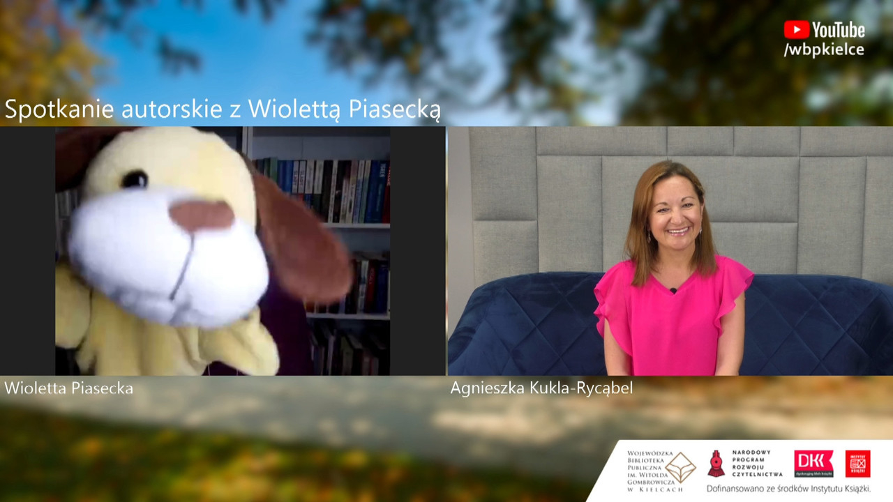8 czerwca 2021 r. na kanale You Tube Wojewódzkiej Biblioteki Publicznej odbyło się spotkanie autorskie on-line skierowane do najmłodszych czytelników. Naszym gościem była Pani Wioletta Piasecka, autorka ponad 20 książek dla dzieci, tekstów piosenek, scenariuszy oraz słuchowisk radiowych. Pisarka przemawiała na temat swoich książkach i ich bohaterów. Autorka wyczerpująco odpowiadała na pytania zadawane przez dzieci z Przedszkola Samorządowego nr 39, które uczestniczyły w spotkaniu. Urozmaicenie wystąpienia stanowiła inscenizacja z pacynkami. Pani Wioletta Piasecka zapewniła młodym uczestnikom wspaniałą literacką zabawę