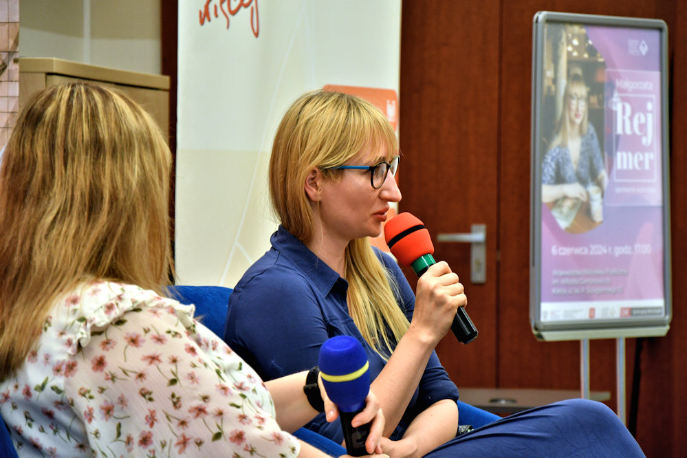 6 czerwca gościliśmy w naszej bibliotece Małgorzatę Rejmer reportażystkę, powieściopisarkę, absolwentkę kulturoznawstwa. Za swoją debiutancką powieść Toksymia nominowała została do Nagrody Literackiej Gdynia. Za książkę Bukareszt. Kurz i krew zdobyła Nagrodę Newsweeka im. Teresy Torańskiej w kategorii literatura faktu. W 2019 roku otrzymała Paszport Polityki w kategorii Literatura oraz Nagrodę Kościelskich za kolejną książkę reportażową Błoto słodsze niż miód. Głosy komunistycznej Albanii. W 2023 roku ukazała się jej książka Ciężar skóry – zbiór dziesięciu opowiadań prozatorskich.