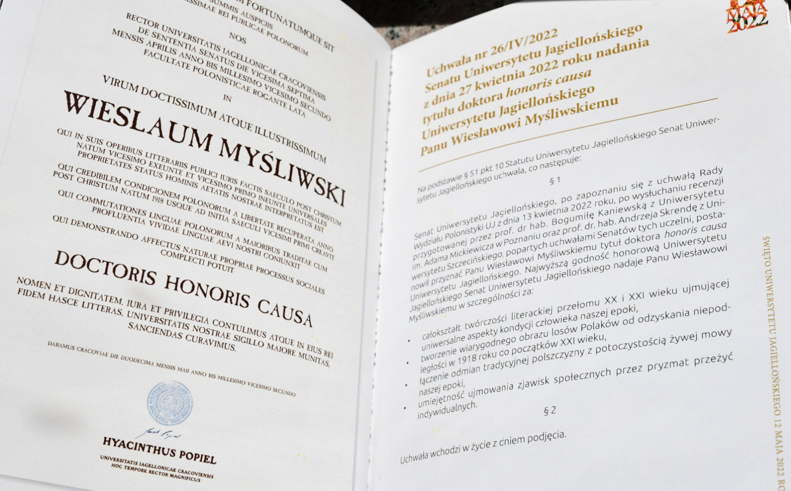Uroczyste wręczenie doktoratu honoris causa Panu Wiesławowi Myśliwskiemu (12.05.2022)