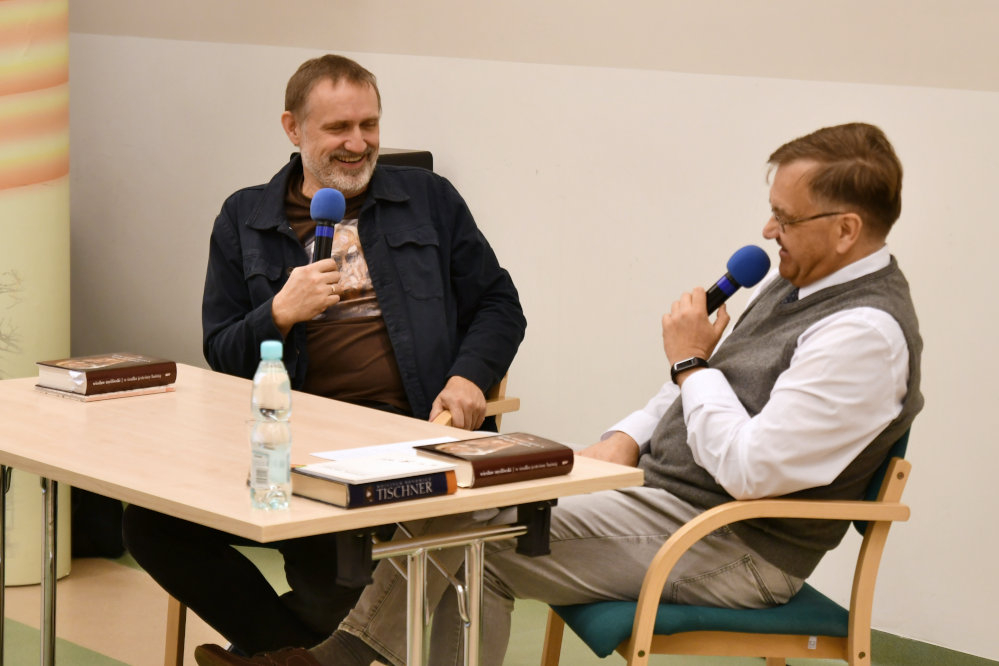 Na zdjęciu Wojciech Bonowicz z prowadzącym spotkanie Piotrem Żakiem.