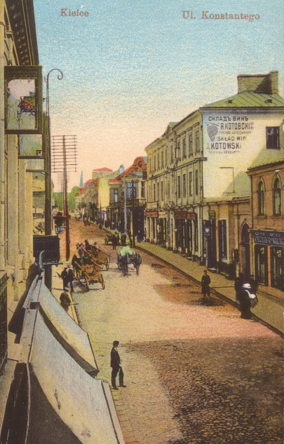 Z kolei druga pocztówka prezentuje południową część ulicy Konstantego z przejeżdżającymi po bruku furmankami.